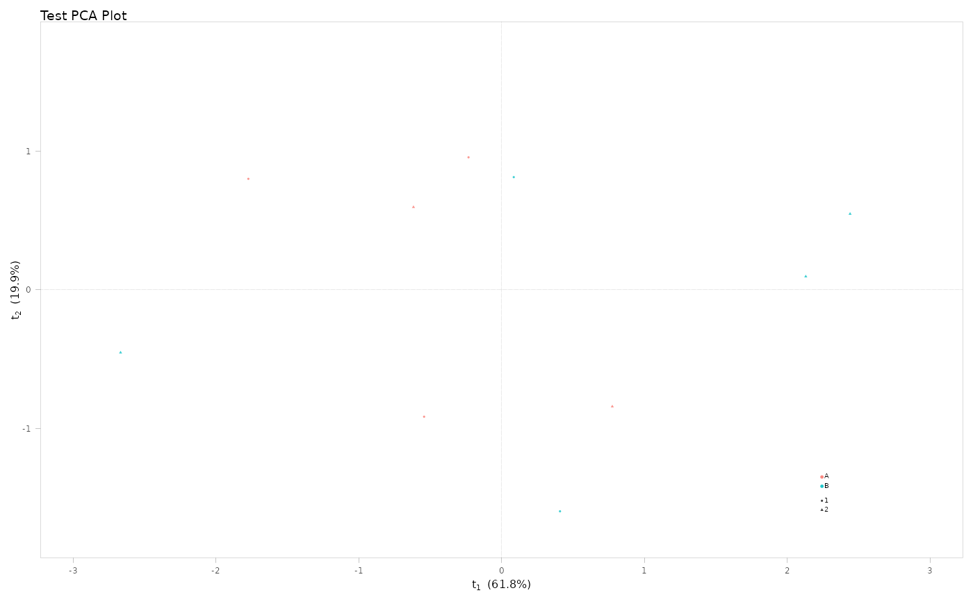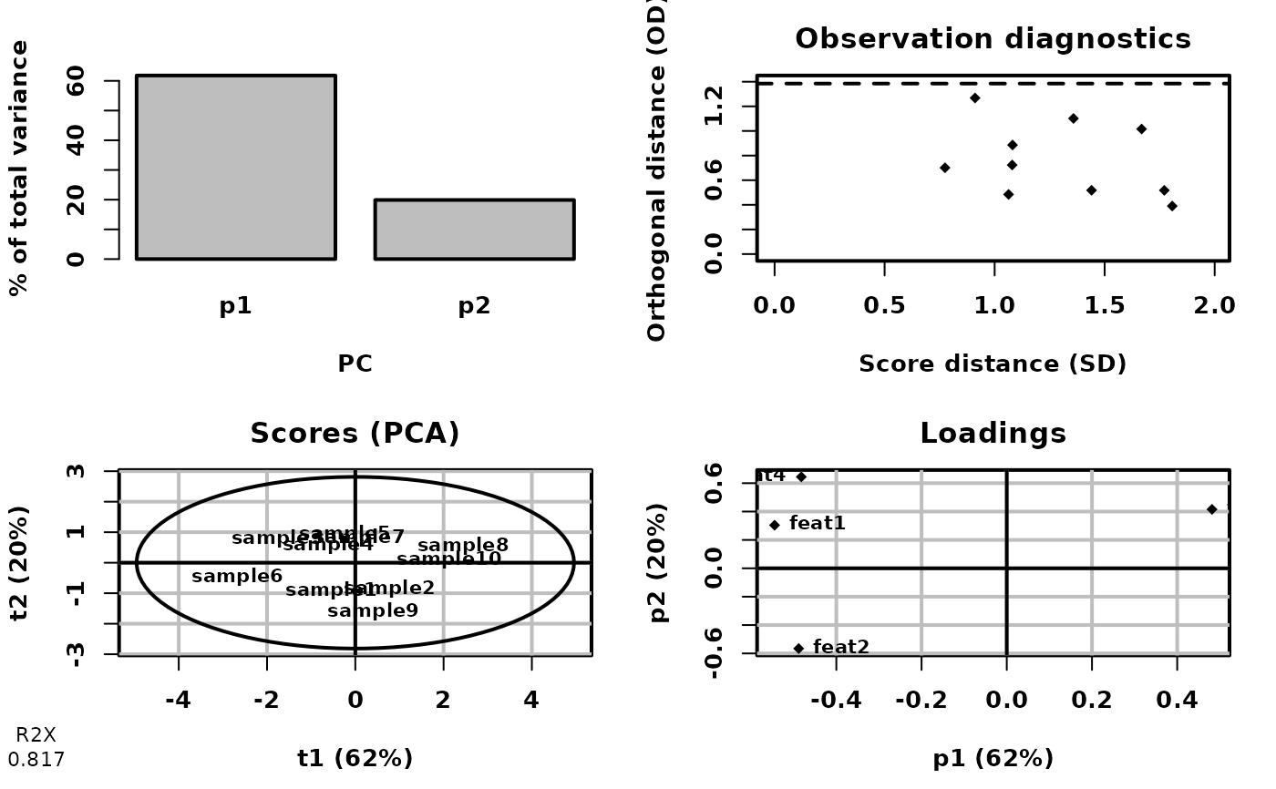 Performs PCA, PLS, or OPLS using ropls and generates a formatted scores plot based on the first two components.
